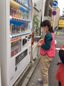 ビブスをつけた後、自動販売機まで移動しました。そこで飲みたいジュースを選び、各自お財布から必要な小銭を出して買いました。