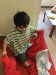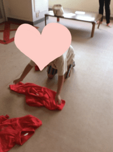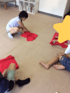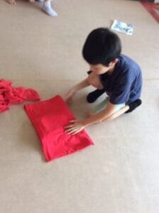 スタッフがたたみ方を教えるとすぐに覚えてできる子どももいれば、「お家でお手伝いしてる!」とすぐに上手くたためる子どももいました☺