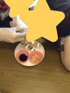 ポッキーが折れないように刺すのが難しそうでしたが、慎重に頑張っていました♪