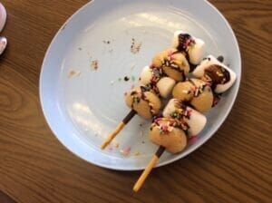 刺し終わったらスプーンで上にチョコソースとカラースプレーを乗せて完成です!