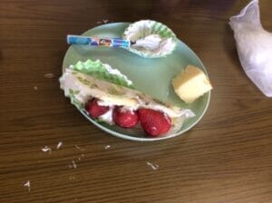 チーズケーキを軽く半分に折り、そこに生クリームを乗せて最後にいちごを置きます。