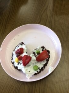 生クリームの上にいちごとマーブルチョコを乗せたら完成です😊