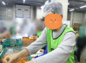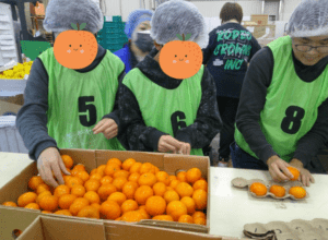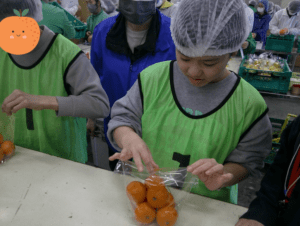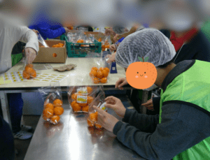 今回の内容は、みかんの袋詰めのライン作業🍊です。綺麗なみかんの見極め、個数、入れ方、シールの貼り方などを学びながらそれぞれのできる仕事に取り組みました。